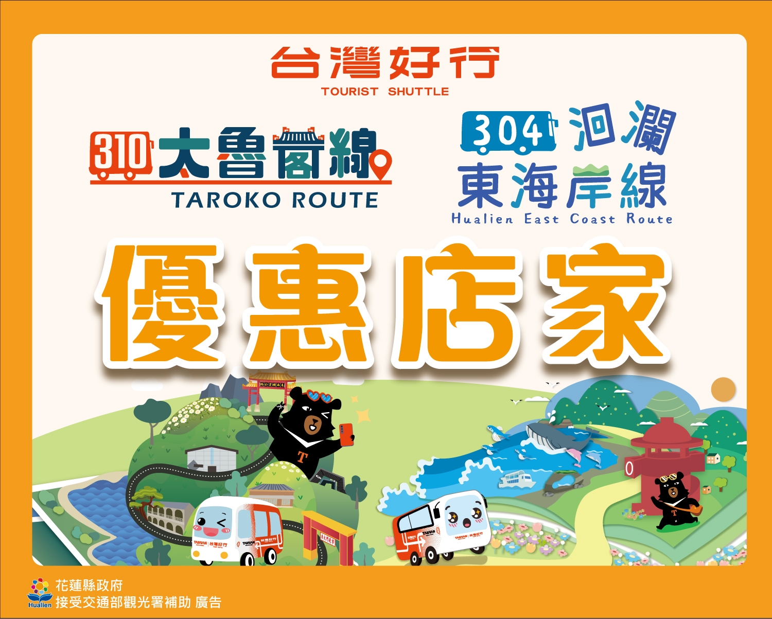 出示與台灣好行310太魯閣線或304洄瀾東海岸線站牌合照(或 一日券) 消費95折優惠,特價品除外