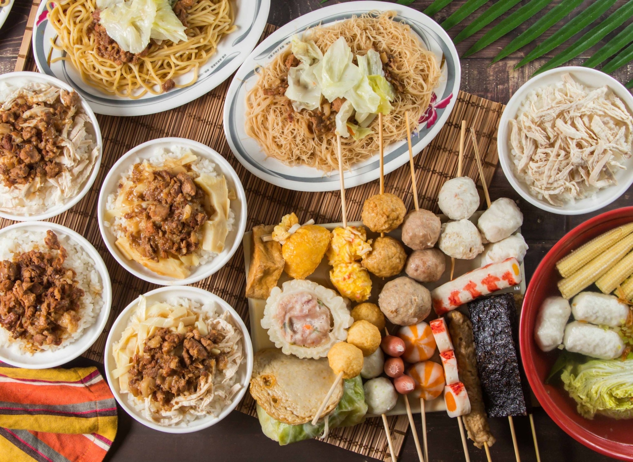 Oden: Menu items including cabbage rolls stuffed with pork, bitter gourd stuffed with pork, pork balls, radish, stir-fried noodles, rice noodles, rice with ground pork, rice with sliced chicken, rice with shredded bamboo shoots, rice with both sliced chicken and shredded bamboo shoots.