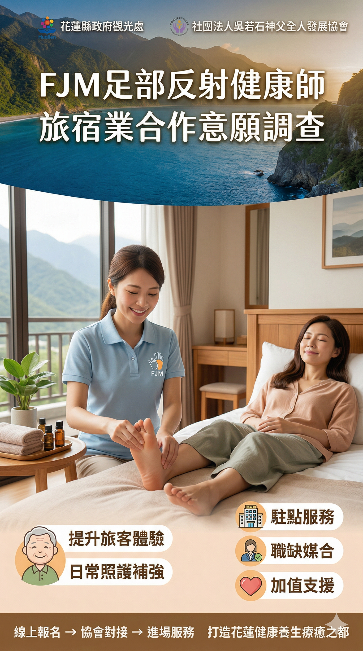 花蓮縣政府觀光處推動「FJM足部反射健康師」導入旅宿服務,強調手法簡單、安全、具實證效益,可提升旅客深度舒緩體驗,並補強高齡社會之日常照護量能。