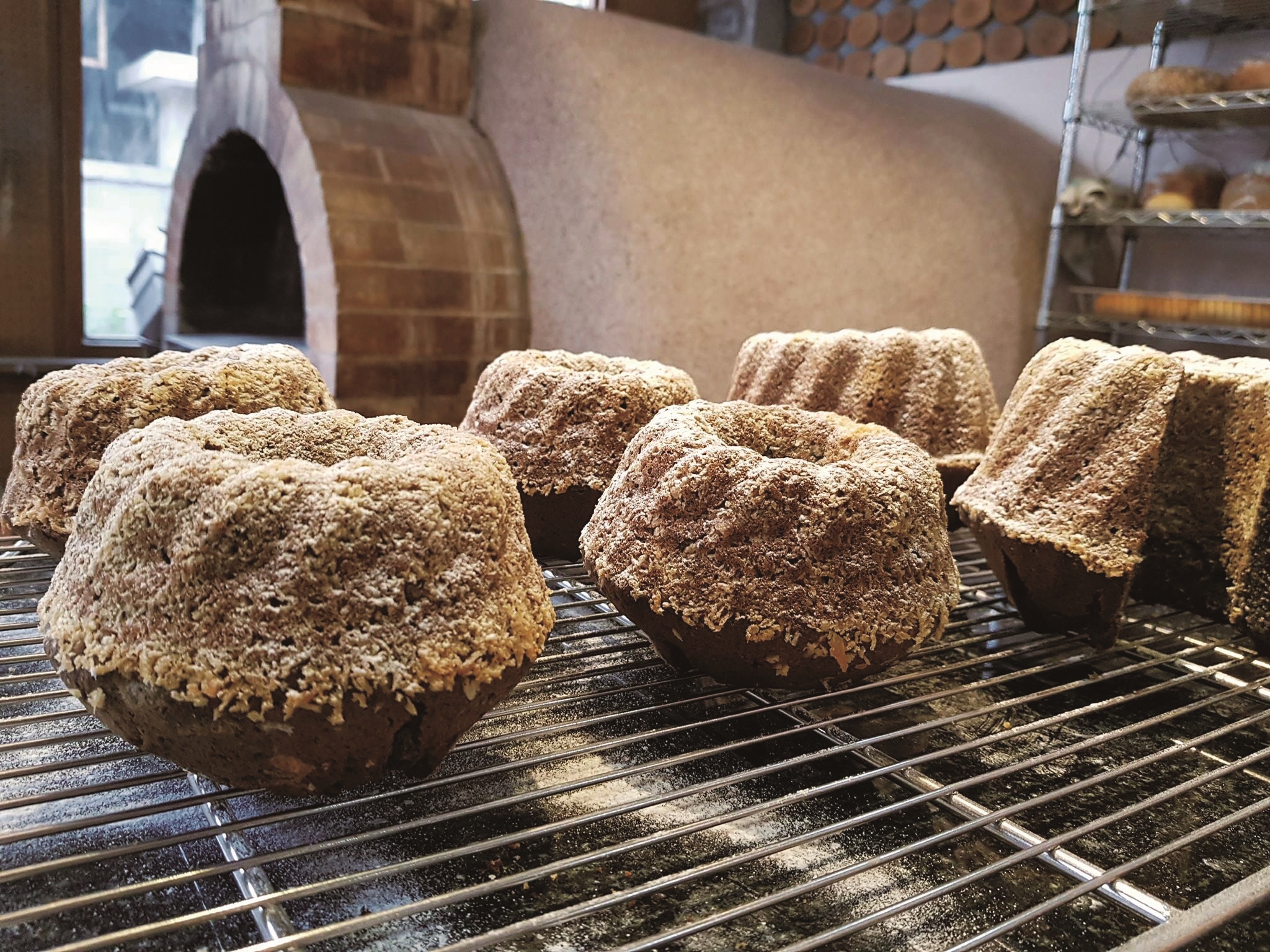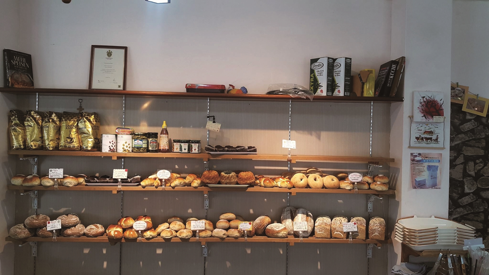 「iOven愛窯」は伝統的なパンの焼き方を守り、自ら造った石窯を使用しています。薪は康庭さんが果樹の剪定を手伝った時のものや台風で飛ばされた樹木等から得ています。原材料は品質、手作り、全穀粒使用にこだわり、添加物、助剤、改良剤、防腐剤、香料を一切使用していません。また、ライムギ、スペルト小麦、小麦粉はドイツ、コーヒーはウィーンから輸入し、その他の原料は花蓮で購入しています。お店にはパンやケーキの種類も豊富で、80%がライムギパン、全粒粉くるみパン、ウィーンのツォップ、「咕咕霍夫」のケーキ等です。