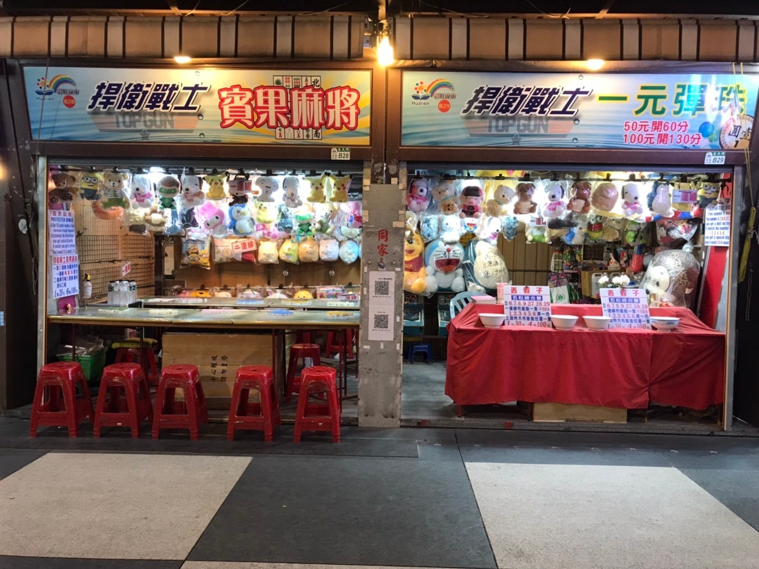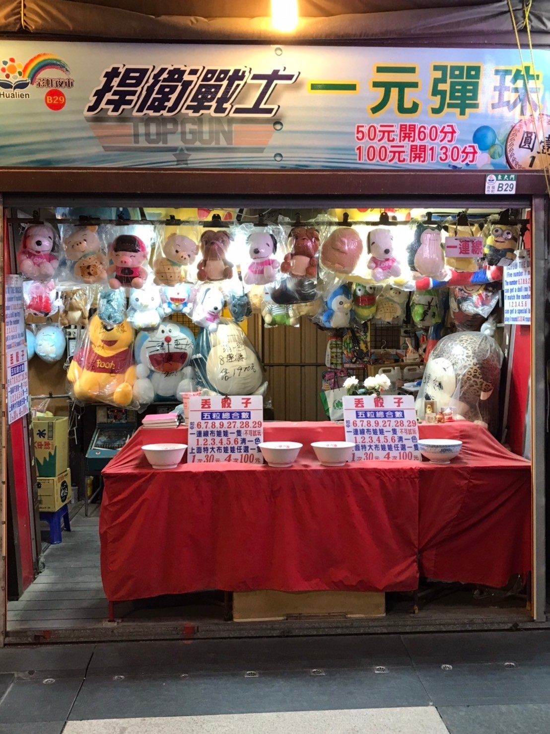 판매 상품:봉제 인형, 봉제 완구상품 소개:B28과 같은 노점에서 운영합니다.게임1: 1TWD 핀볼. 50TWD 기본 점수는 60점, 100TWD 기본 점수는 130점이며, 스코어보드 점수에 따라 상품을 교환할 수 있습니다.게임2: 주사위 던지기. 주사위 5개로 게임을 진행하며, 주사위 지정 숫자(6, 7, 8, 9, 27, 28, 29)에 따라 봉제 인형 한 개를 받을 수 있으며(주사위 5개의 총합 수), 같은 숫자 5개가 나오면(1, 2, 3, 4, 5, 6) 칭이써로 ‘초대형’ 봉제 인형 한 개를 받을 수 있습니다. 한 판에 30TWD, 네 판에 100TWD(시범 게임 불가)